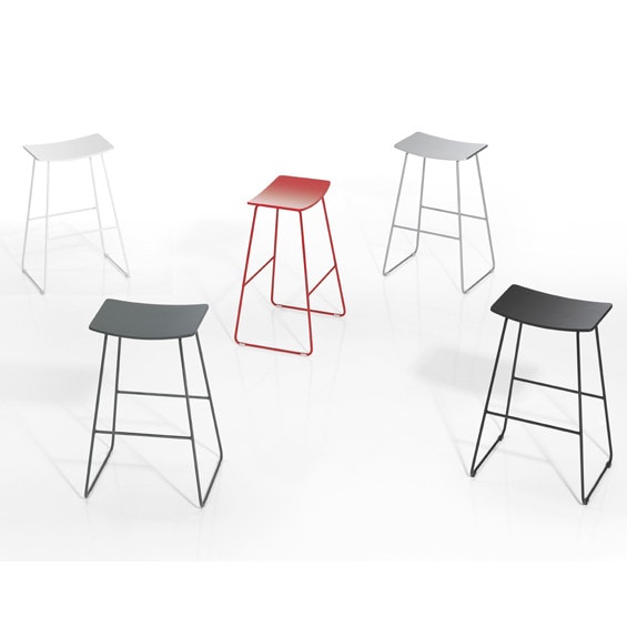 Counter stool with steel frame finished in lacquer or chrome, and concave seat in lacquered or stained beech, or solid oak.