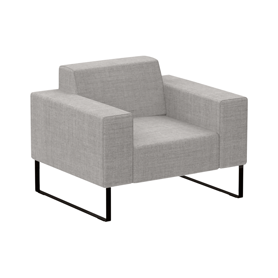 Upholstered armchair W.39.4″ with arms W.7.9″ and steel plate legs.