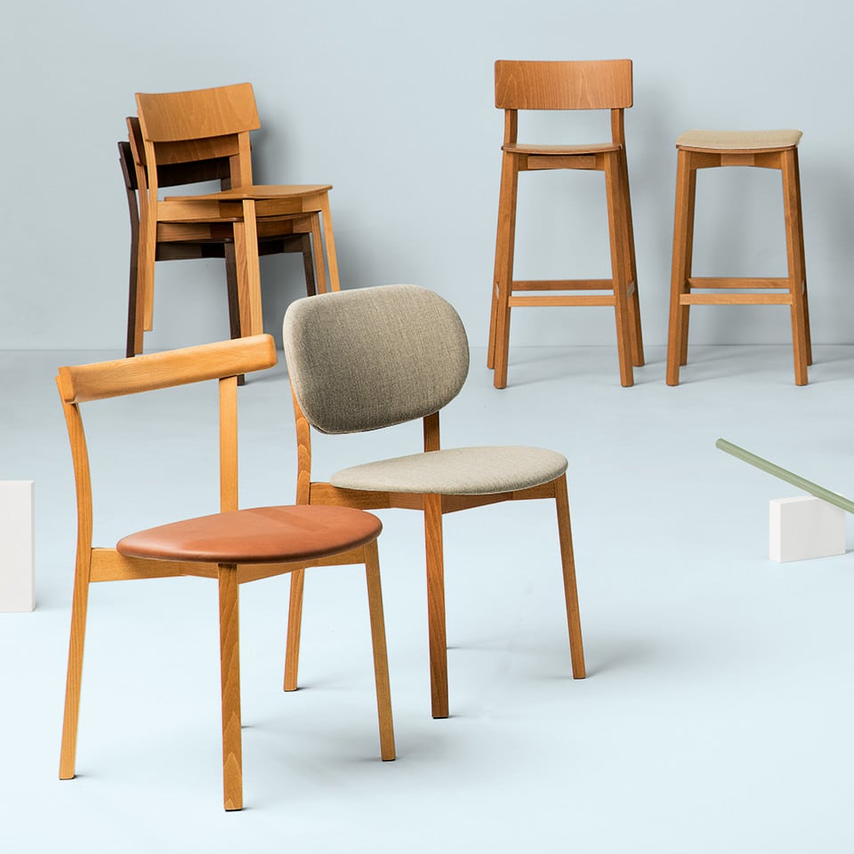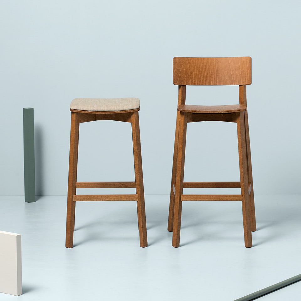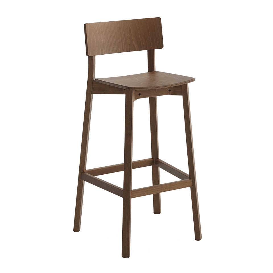 Counter stool with a wooden seat on a solid beech frame fitted with a stainless steel kick-plate on the front footrest. Produced to custom height per customer specification, from 23.5”-27.5” seat height