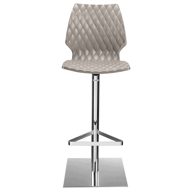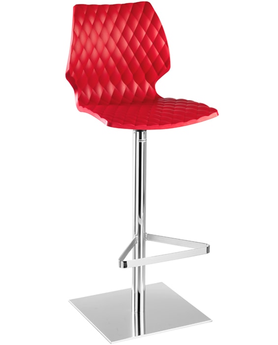 Barstool with polypropylene seat which meets BIFMA x 5.1 strength test. Column base in steel. Swivel with memory return. Front of seat has padded-effect texture, while the back appears in a glossy finish.