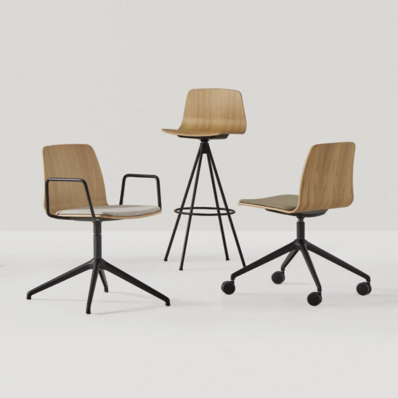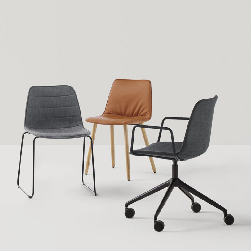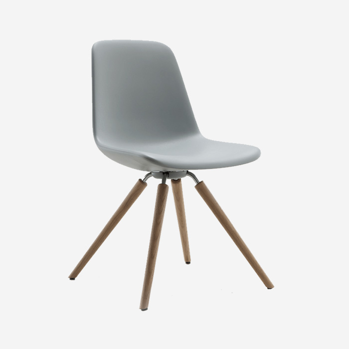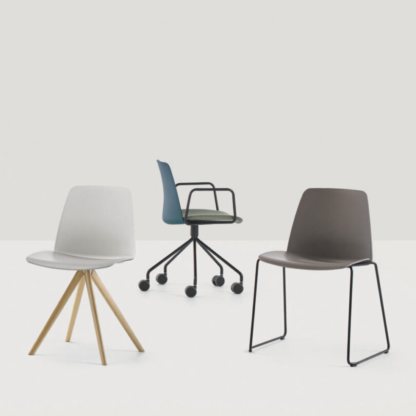 Side chair with seat and back in polypropylene on a 4 leg epoxy coated base with casters. Greenguard Certified.