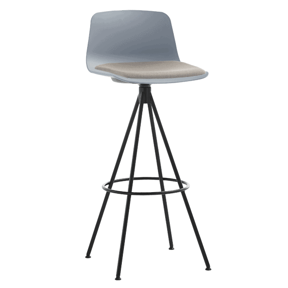 4-spoke barstool on a swivel steel base, with upholstered seat and polypropylene back. Greenguard Certified.