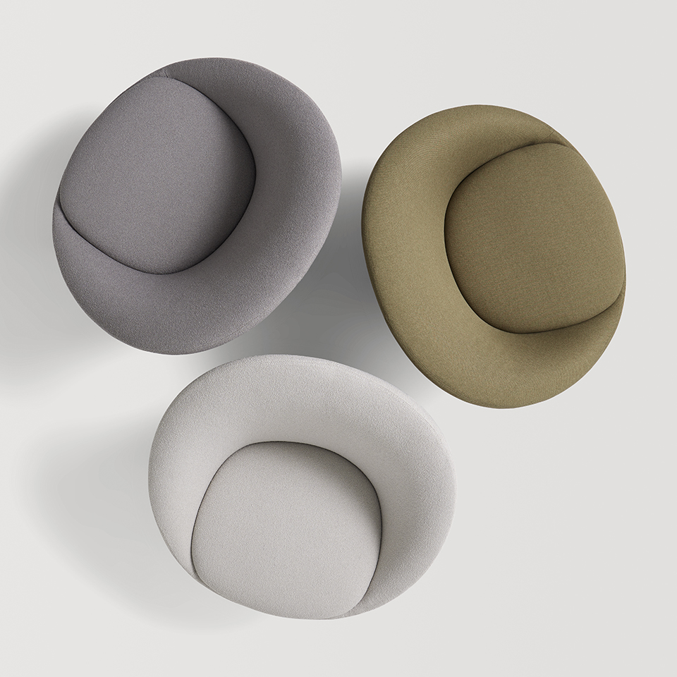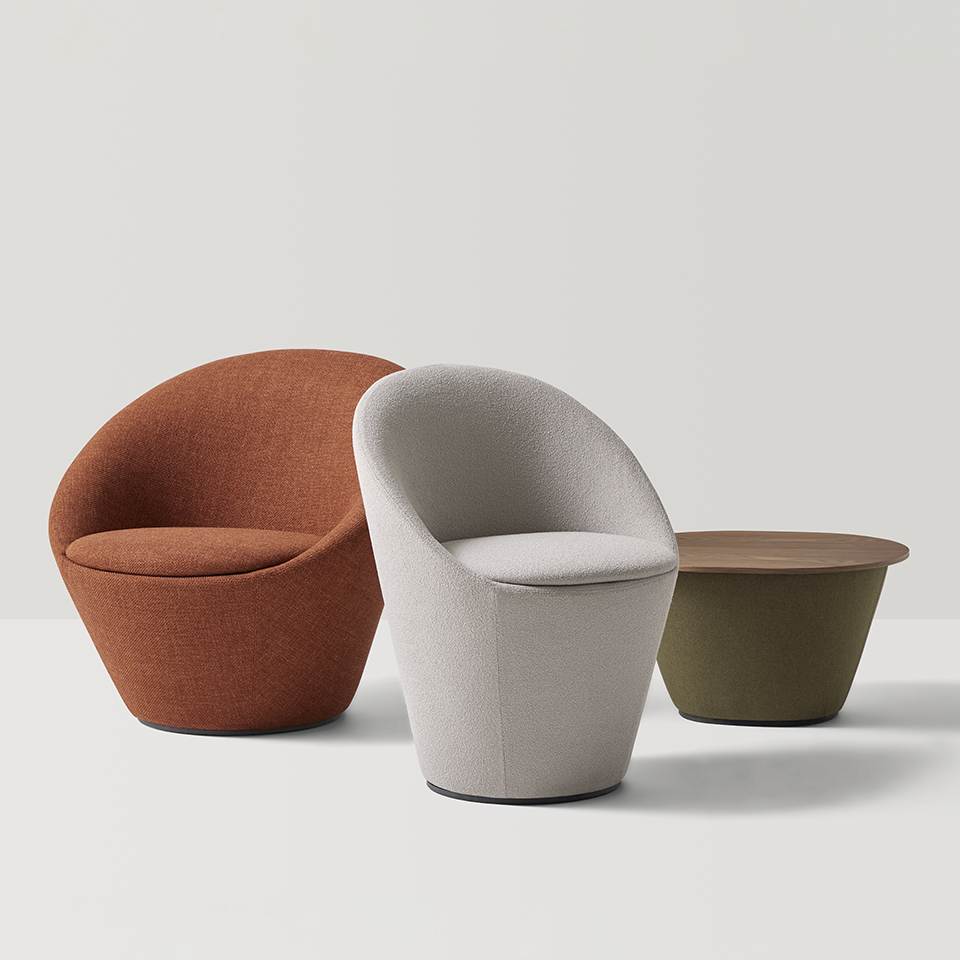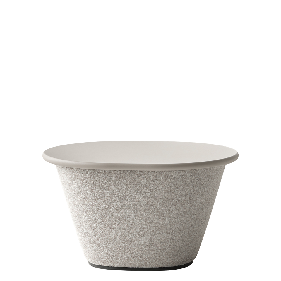 Upholstered low table with an inner shell made of rotomoulded polyethylene.