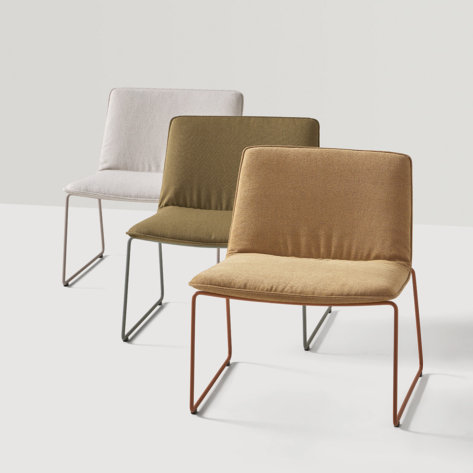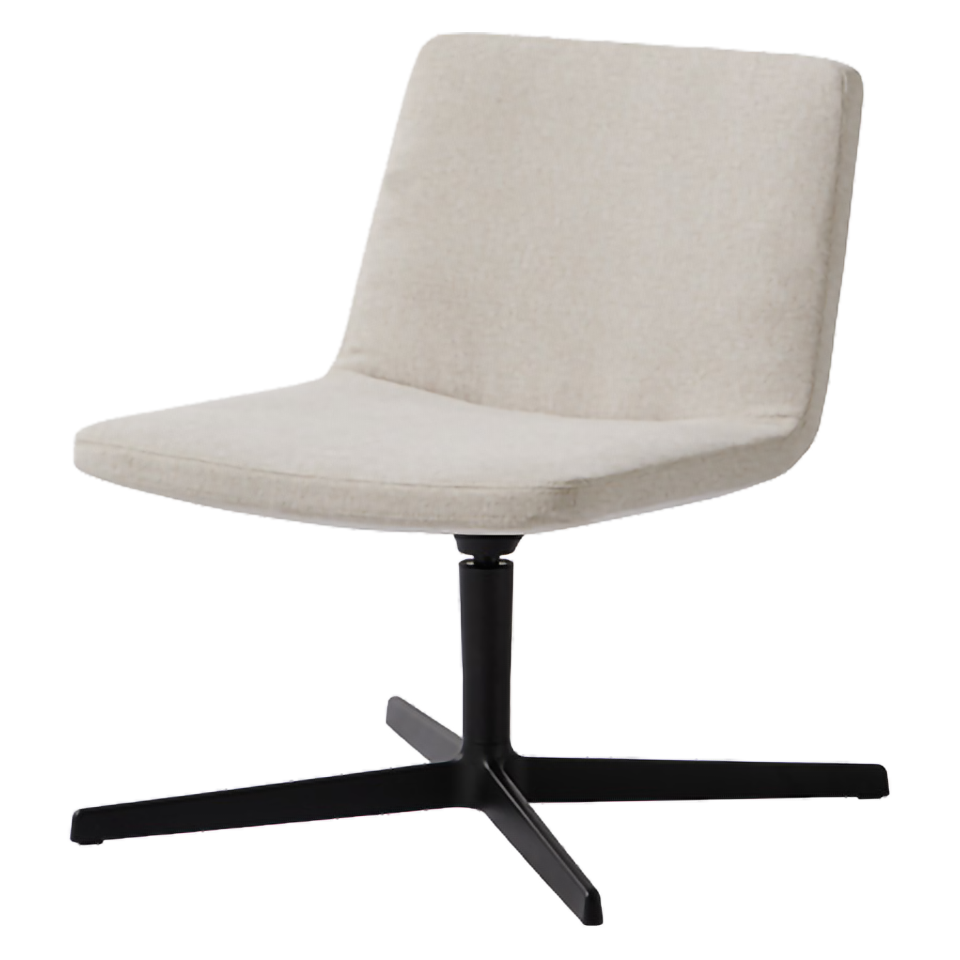 Lounge chair with low backrest and four spoke base with upholstered seat shell.