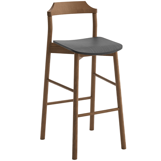 Barstool with laminate seat on a solid beech frame fitted with a stainless steel kick-plate on the front footrest.