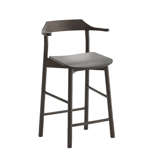 Counter stool with wooden seat and back on a solid beech frame with armrests. Fitted with a stainless steel kick-plate on the front footrest