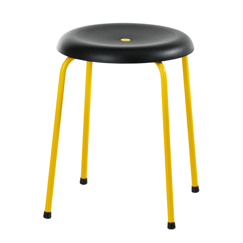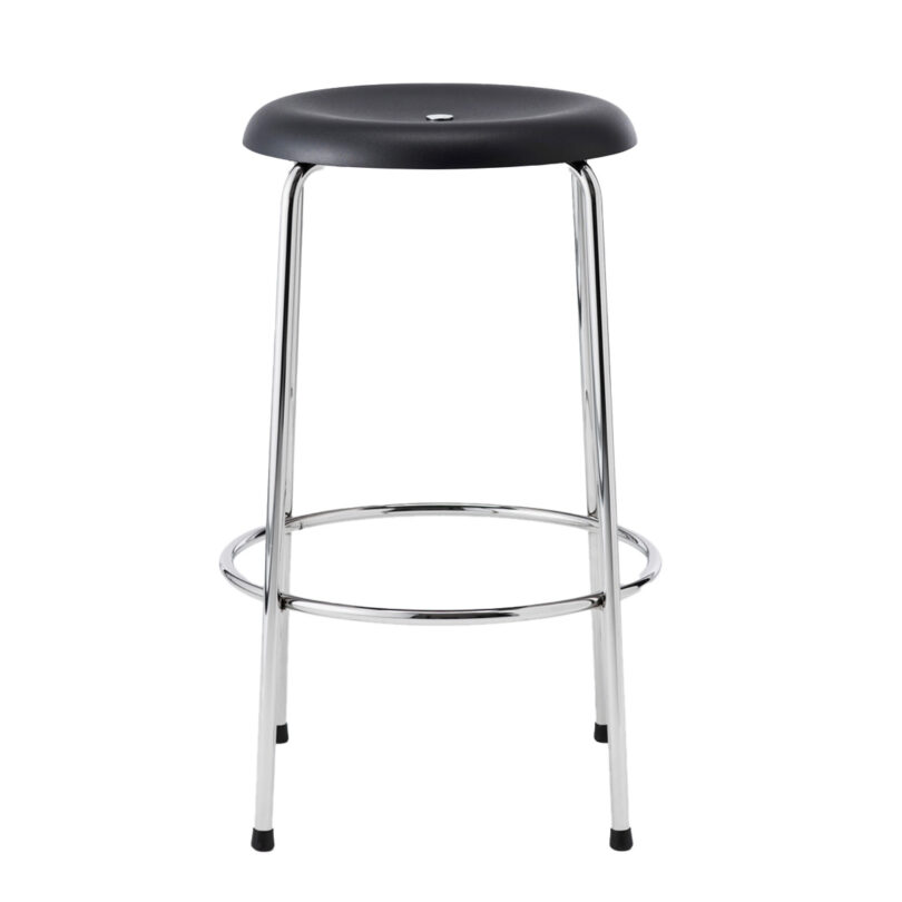 Stackable stool with seat in white, grey, black, red or orange ABS plastic and a powder coated or chromium plated tubular steel frame.