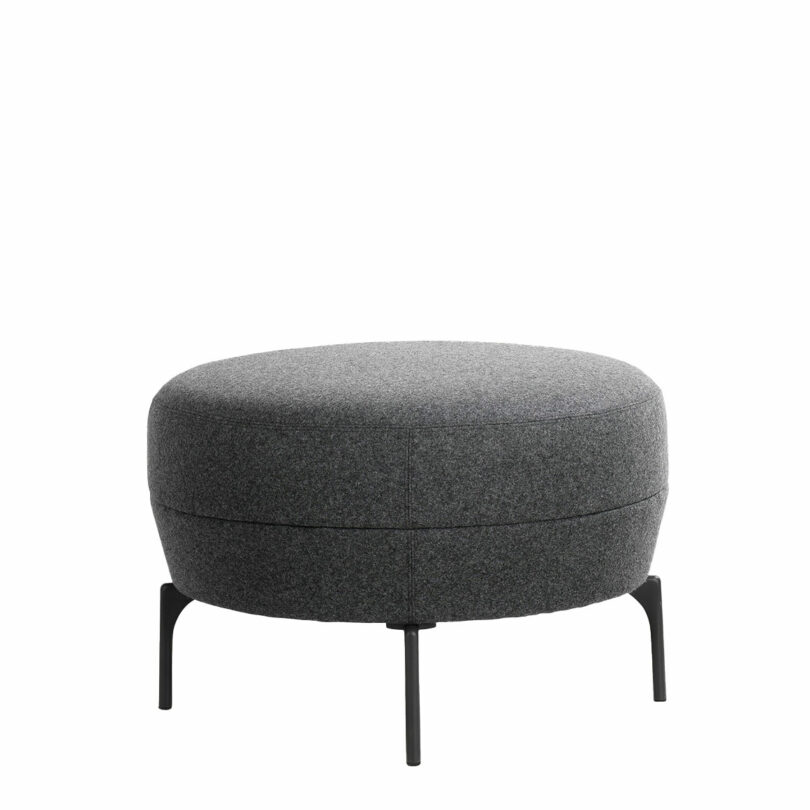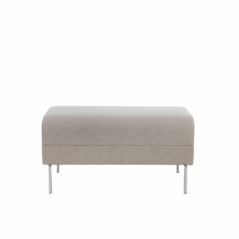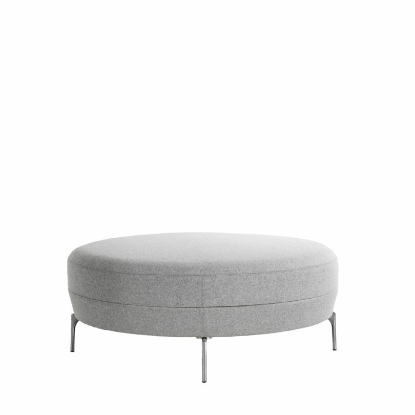 Upholstered ottoman on legs of powder coated or chromium plated cast aluminium.
