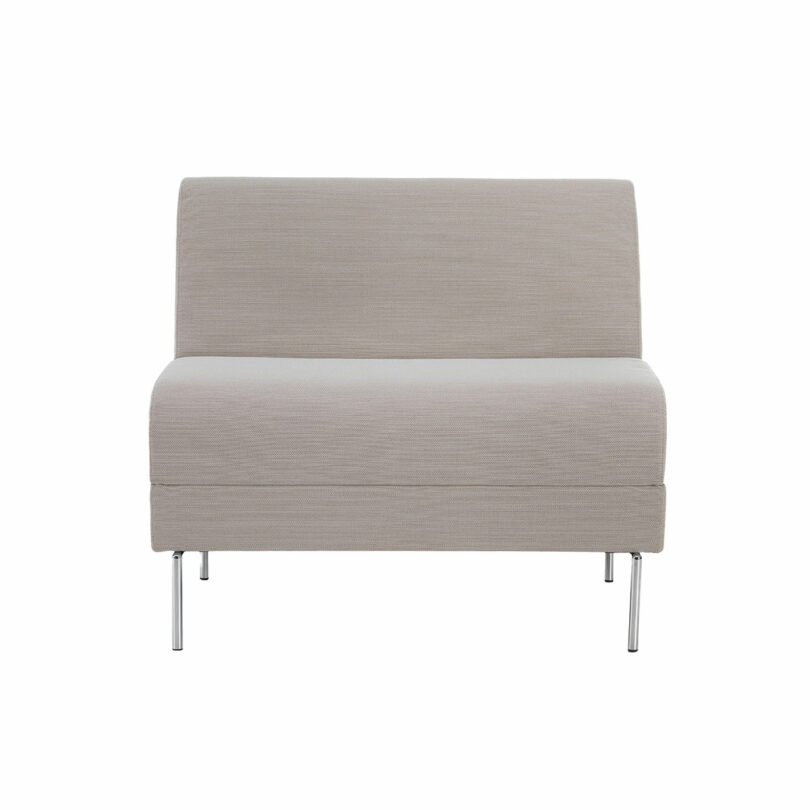 Modular sofa unit on legs of powder coated or chromium plated cast aluminium. Centre-hand unit with upholstered seat and back and built-in magnetic linking device.