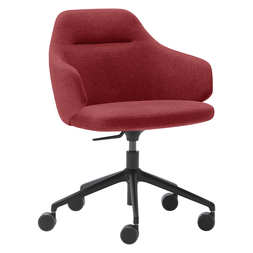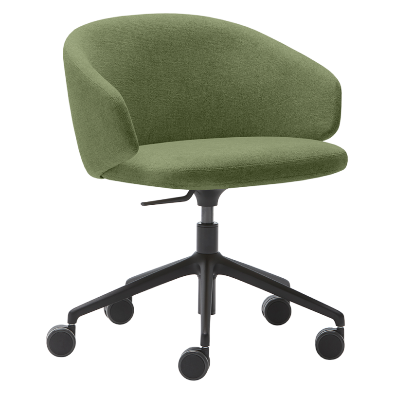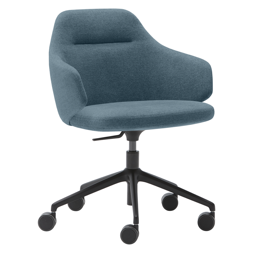 Fully upholstered chair on a 5-spoke aluminium base, with casters. Height adjustable, 360° swivel seat with no return mechanism. Greenguard Gold-certified to protect indoor air quality.