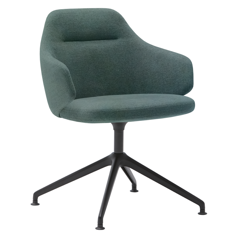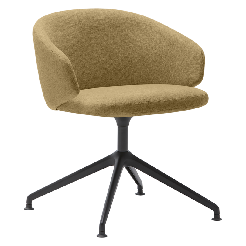 Upholstered armchair with medium backrest and 4-spoke swivel aluminum base. The seat height is not adjustable.