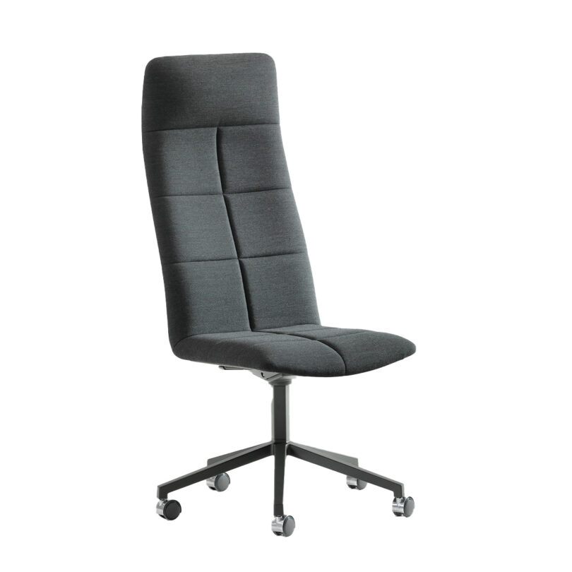 Conference chair on a 360° swivel powder coated or polished aluminum base on casters. Fully upholstered with quilting detail.