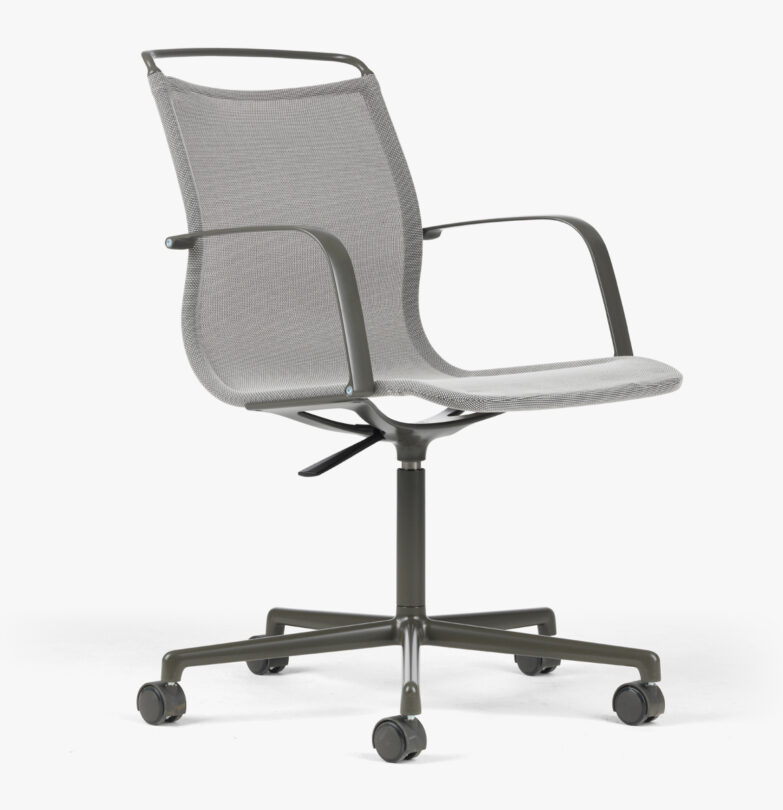 Armchair with 5-feet frame of cast recycled aluminum, casters as standard. Seat shell in mesh with flocked surface.