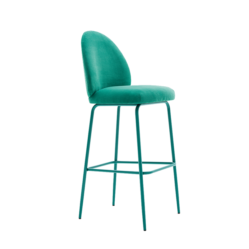 Upholstered barstool on metal legs available in standard lacquers or custom RAL colors. Includes stretchers.