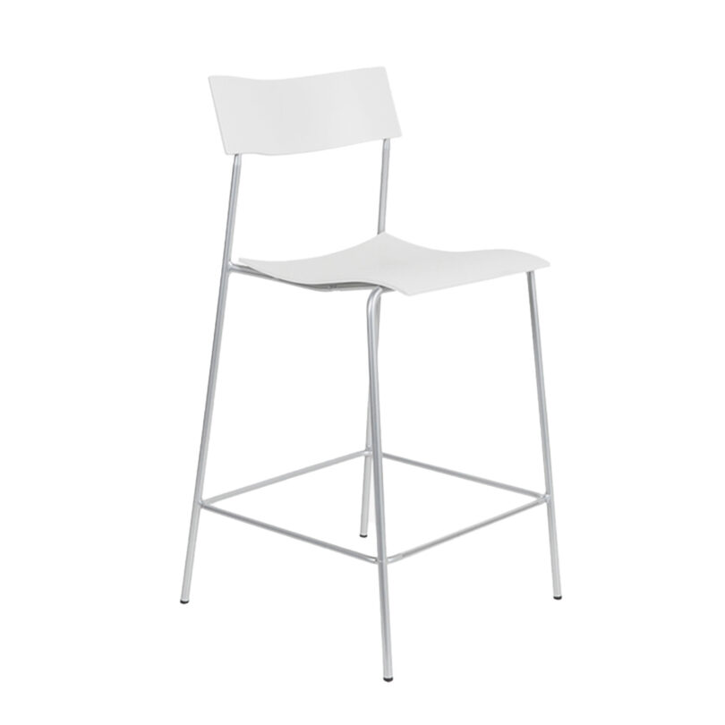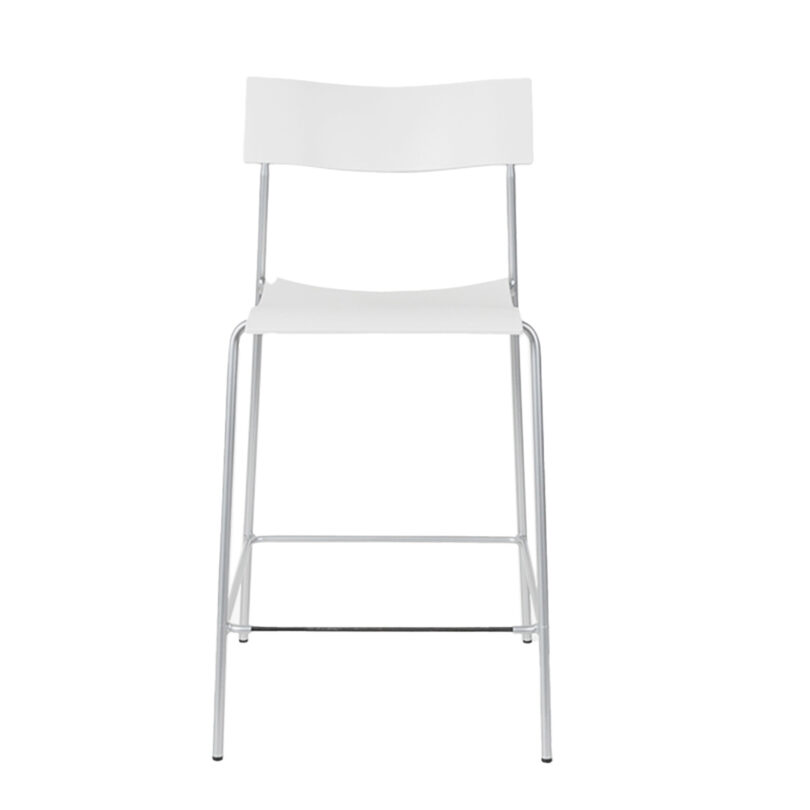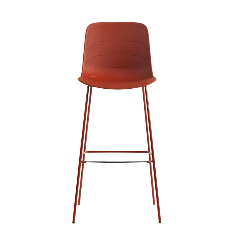 Barstool with recycled polypropylene seat and back on on powder coated or chromium plated steel tubular frame and footrest. Tested to 360 lbs weight load.