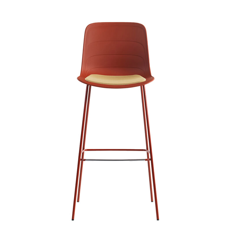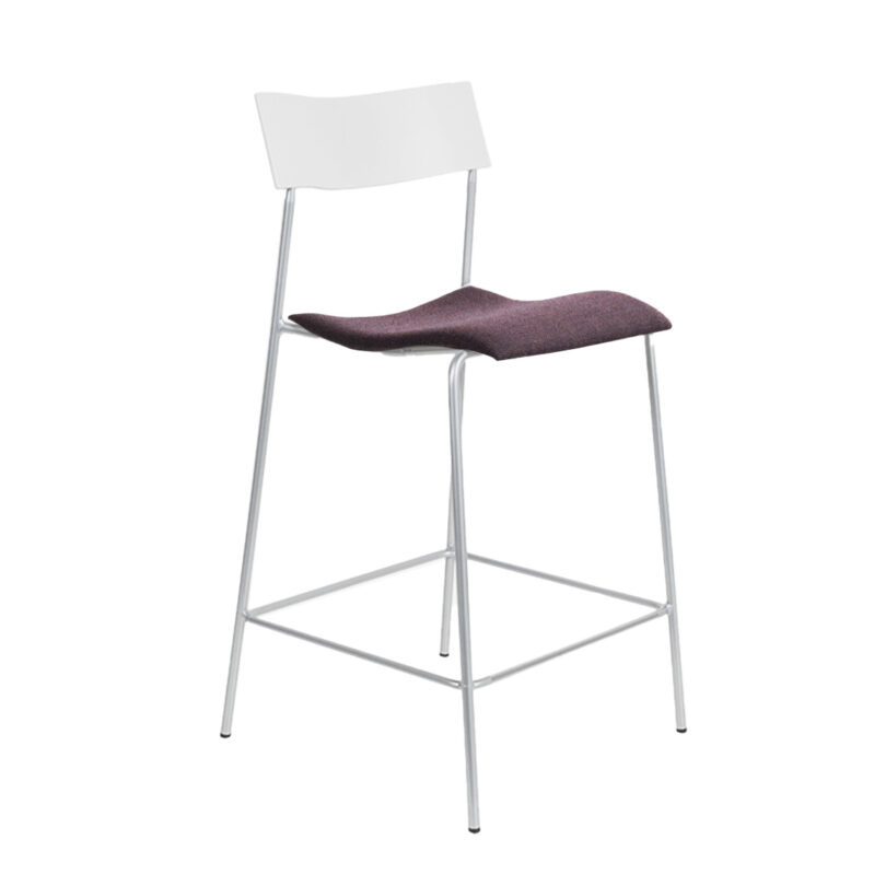 Barstool with fully upholstered recycled polypropylene seat and back on on powder coated or chromium plated steel tubular frame and footrest. Tested to 360 lbs weight load.