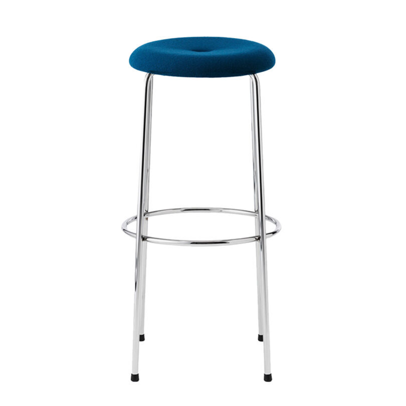 Barstool with upholstered seat and a powder coated or chromium plated tubular steel frame.