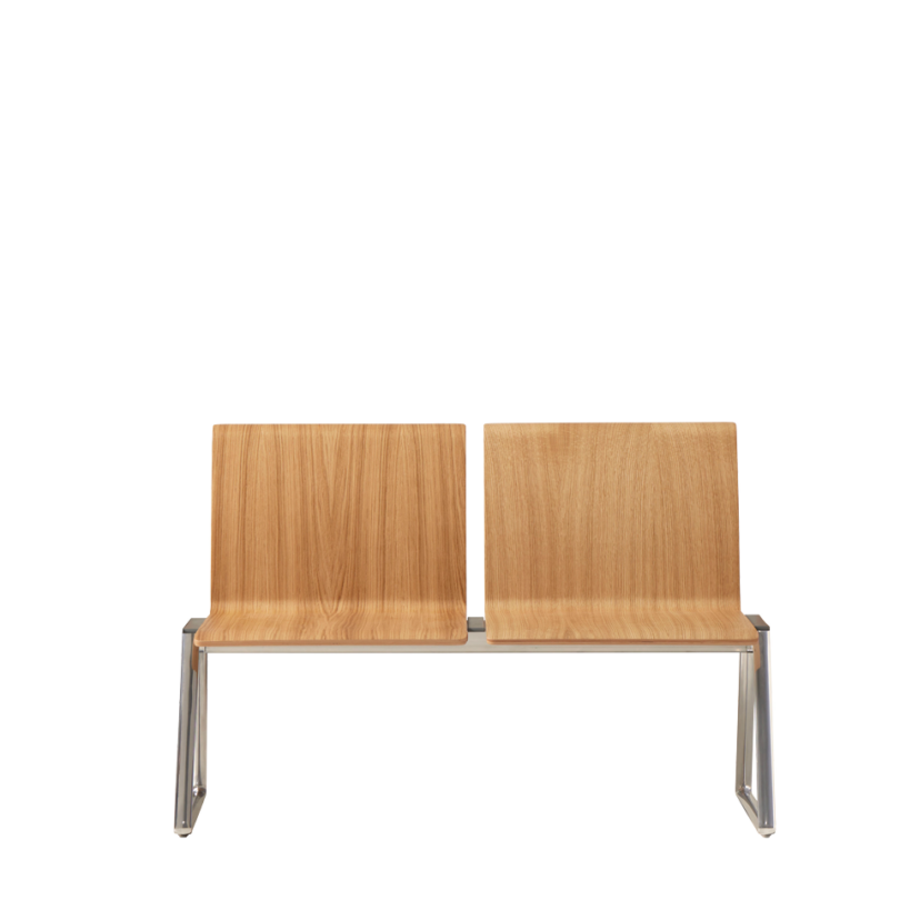 2 seater bench with fully upholstered mono-shell seats and aluminum structural frame with 2 legs, sled base.