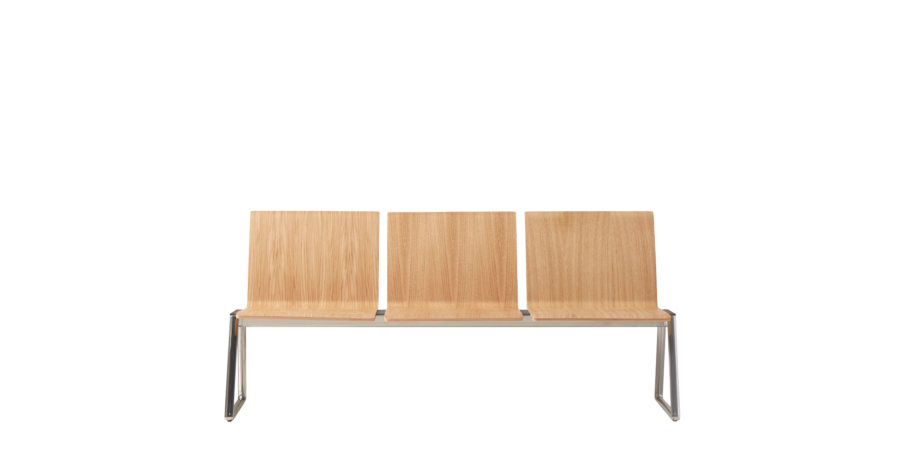 3 seater bench with fully upholstered mono-shell seats and aluminum structural frame with 2 legs, sled base.