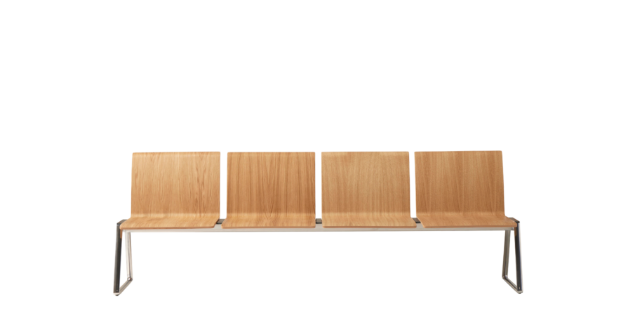 4 seater bench with fully upholstered mono-shell seats and aluminum structural frame with 2 legs, sled base.