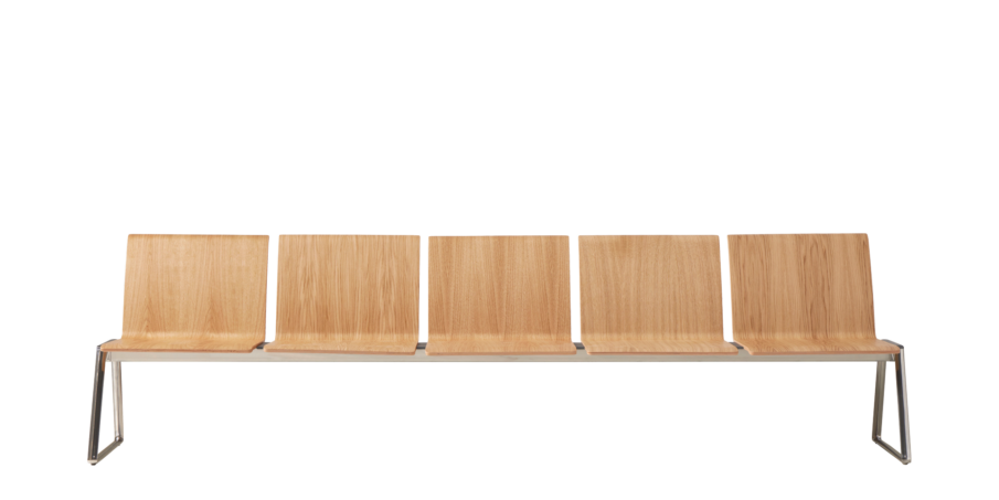 5 seater bench with fully upholstered mono-shell seats and aluminum structural frame with 2 legs, sled base.
