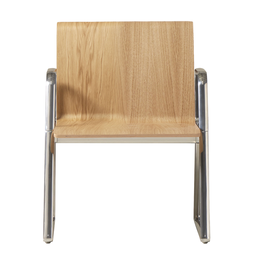 Armchair with fully upholstered mono-shell seat, arms, and aluminum structural frame with 2 legs, sled base.