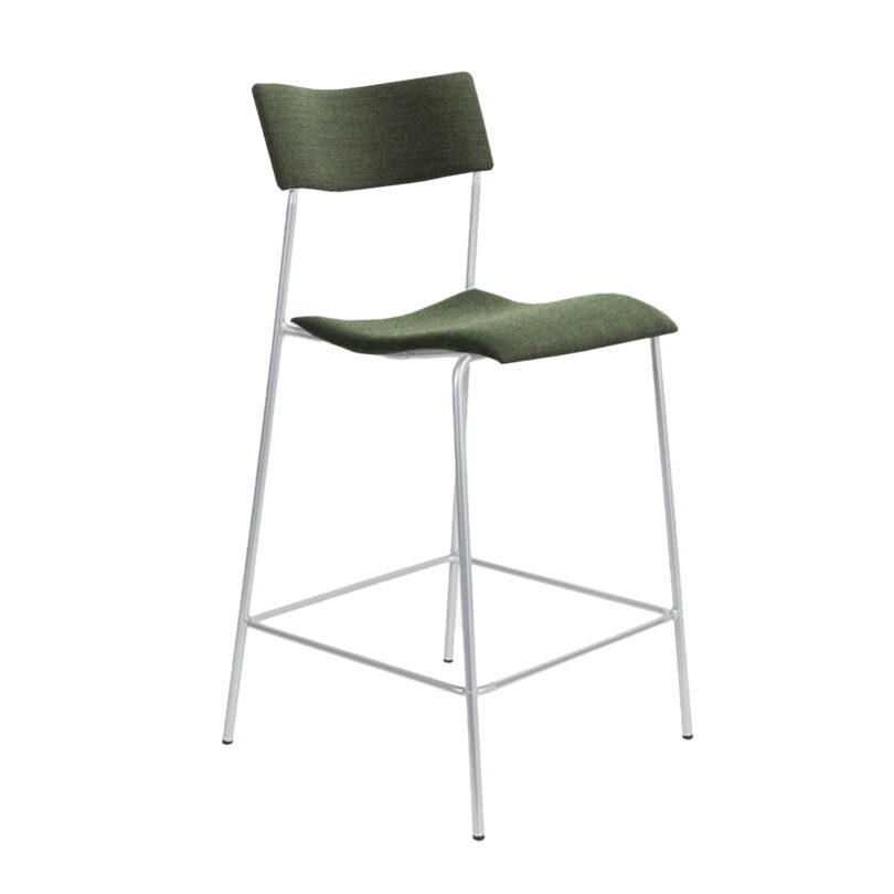 Counter stool with fully upholstered seat and back on powder coated or chromium plated steel frame