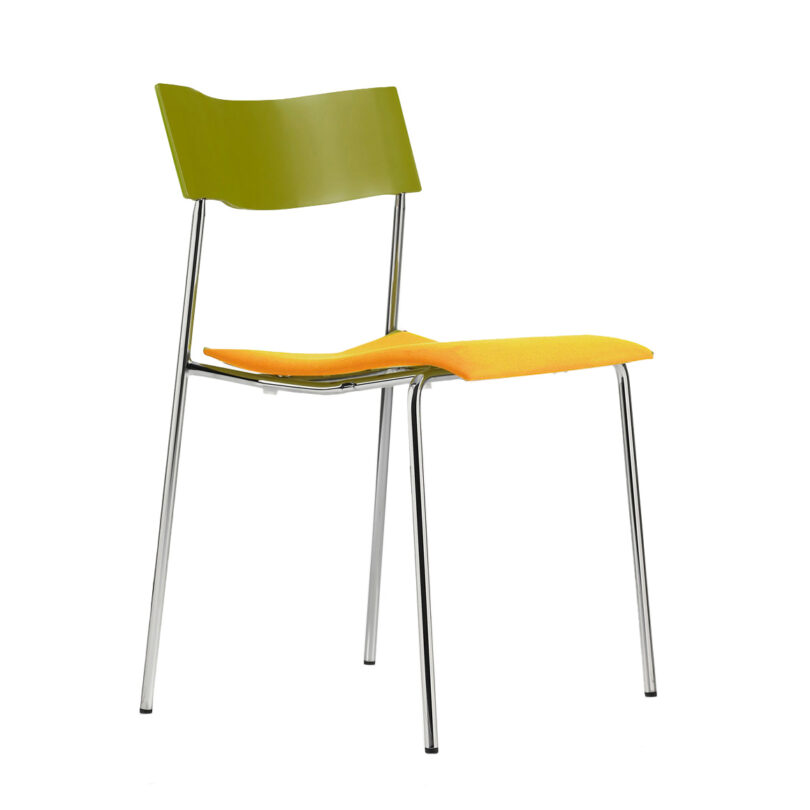 Chair on a powder coated or chromium plated steel frame. Upholstered seat, back in glass-fibre reinforced polyamide.