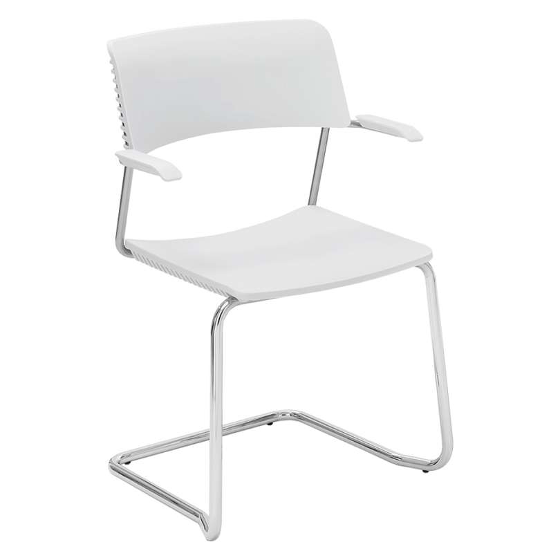 Armchair with a polypropylene shell on a metal cantilever base. Greenguard Certified.