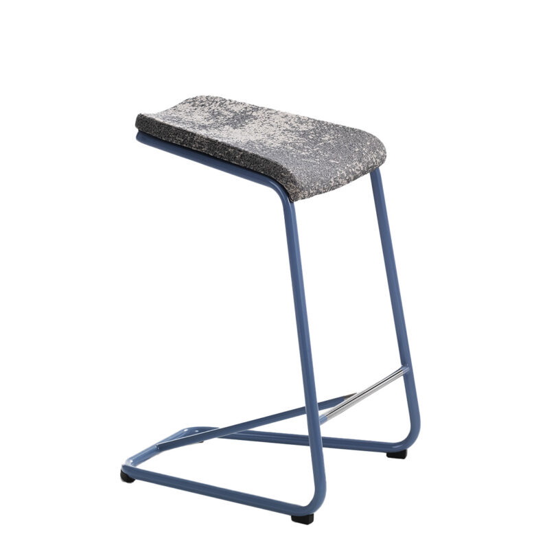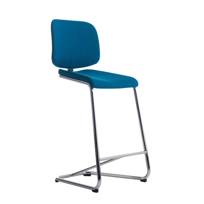 Counterstool with an upholstered seat and a powder coated or chromium plated tubular steel frame with plastic guides and chrome footrest.