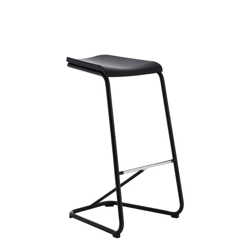 Barstool with seat of molded wood and polyurethane foam, on a powder coated or chromium plated steel cantilever frame. With chrome footrest