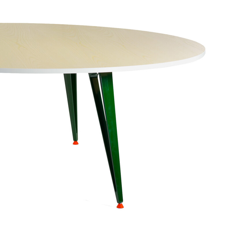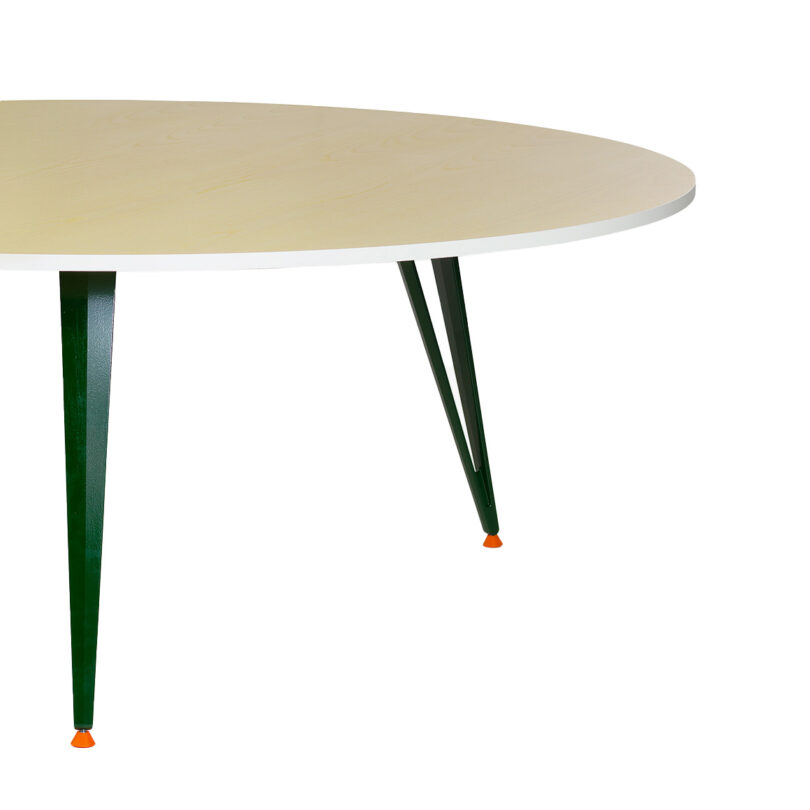 The 60″ inch DIA table is mounted on beams of extruded anodized recycled aluminium, with die-cast recycled texture powder coated legs. The top is available in Driftwood, White Oak, Walnut or alternatively a choice of standard laminate and Forbo LV1 and LV2.