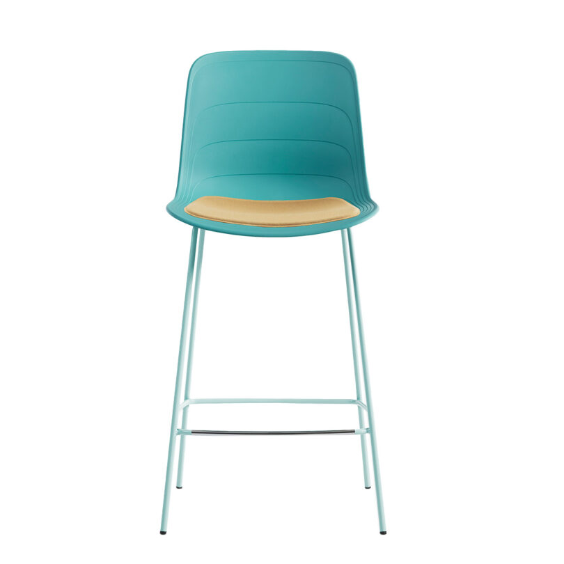 Counter stool with fully upholstered recycled polypropylene seat and back on on powder coated or chromium plated steel tubular frame and footrest. Tested to 360 lbs weight load.