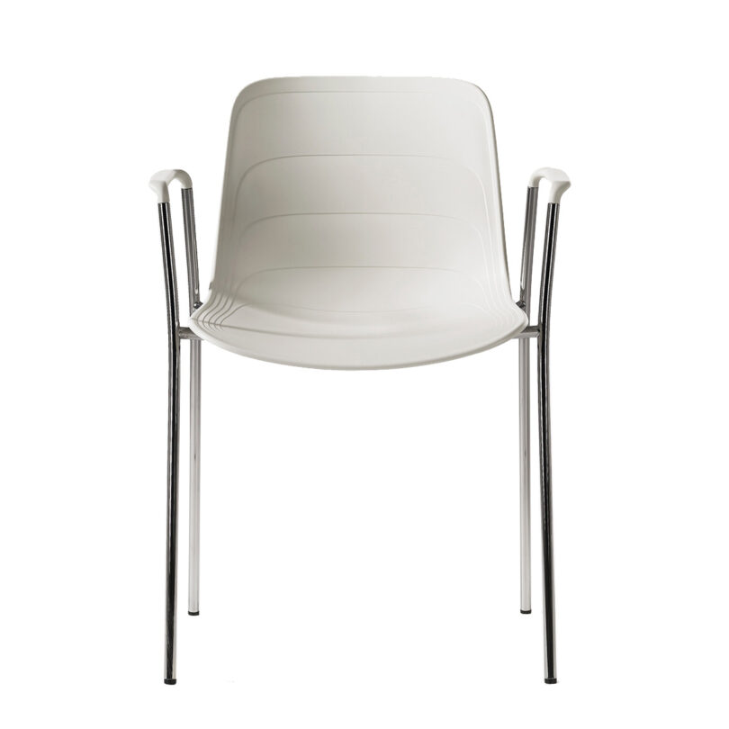 Armchair with recycled polypropylene seat on a powder coated or chromium plated tubular steel frame. Stackable and linkable. Tested to 360 lbs weight load.