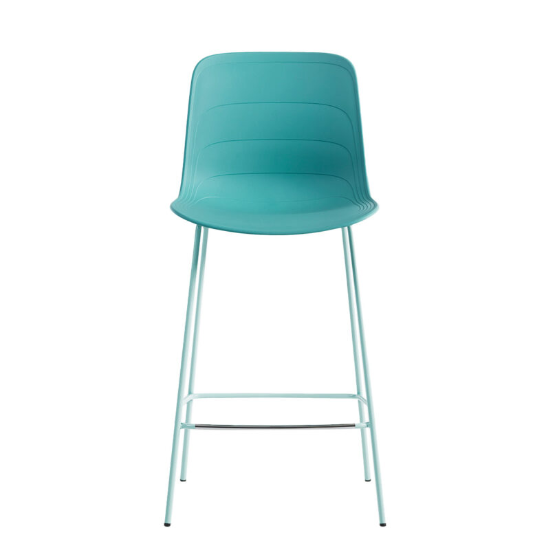 Counter stool with recycled polypropylene seat and back on on powder coated or chromium plated steel tubular frame and footrest. Tested to 360 lbs weight load.