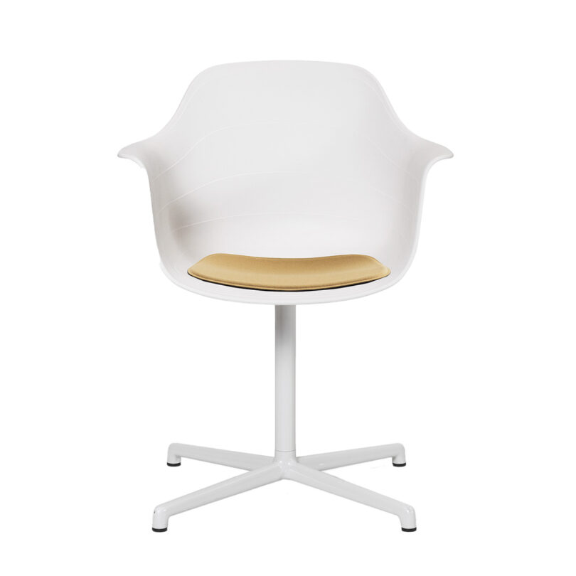 360° swivel armchair with recycled polypropylene seat on a polished aluminum 4 foot base with optional casters. With upholstered seat pad. Tested to 360 lbs weight load.
