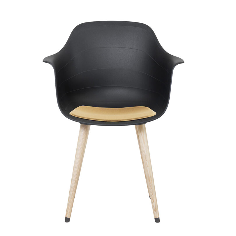 Armchair with recycled polypropylene seat shell on solid ash legs with upholstered seat pad. Tested to 360 lbs weight load.