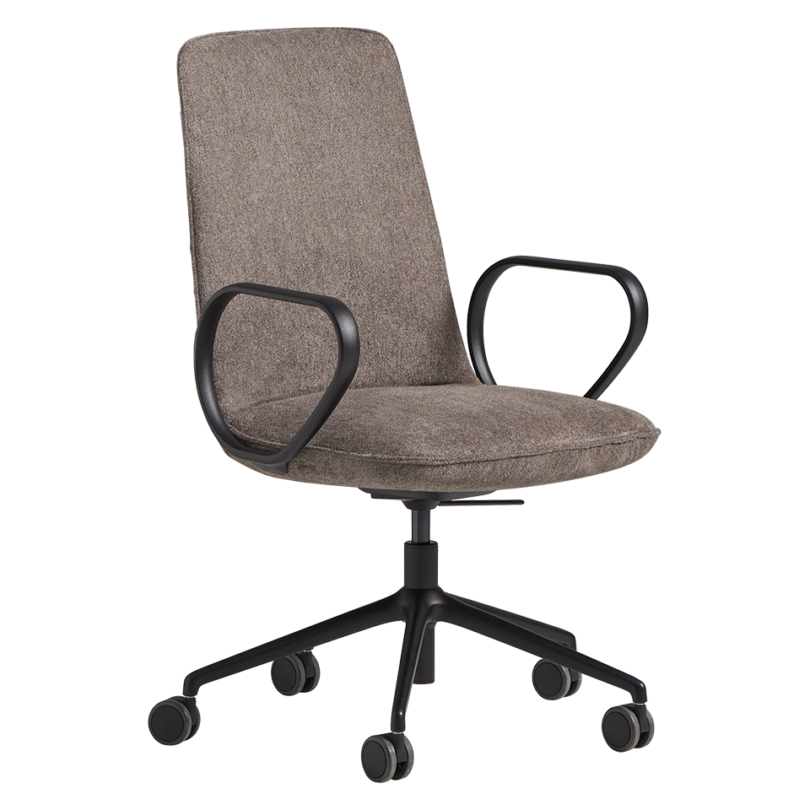 Swivel armchair with medium backrest and 5-spoke cast aluminum alloy base fitted with gas lift column and tilt mechanism. Soft tread casters for hard surface flooring is standard.