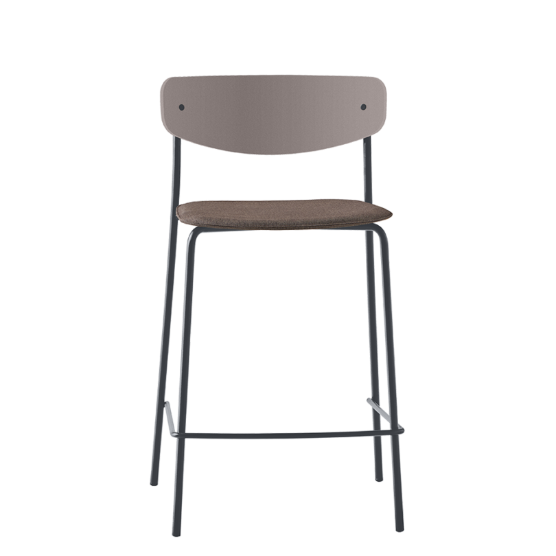 Stackable counter stool with upholstered seat and polypropylene back. Four leg frame in round steel tube and footrest in steel rod.