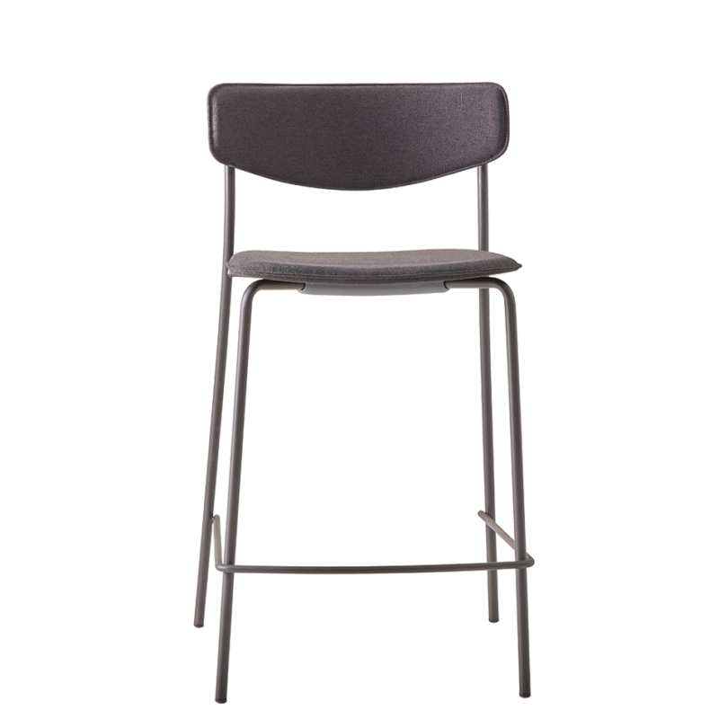 Stackable counter stool with fully upholstered seat and back. Four leg frame in round steel tube and