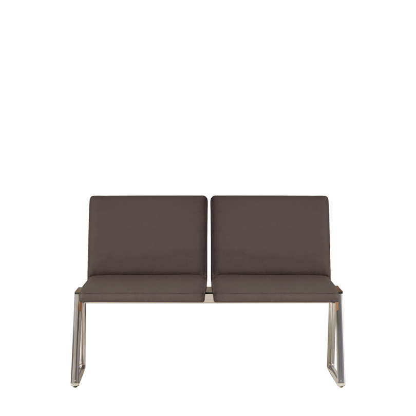2 seater bench with fully upholstered mono-shell seats and aluminum structural frame with 2 legs, sled base.
