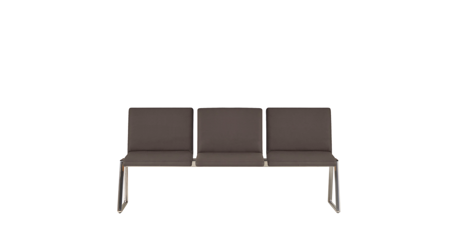 3 seater bench with fully upholstered mono-shell seats and aluminum structural frame with 2 legs, sled base.