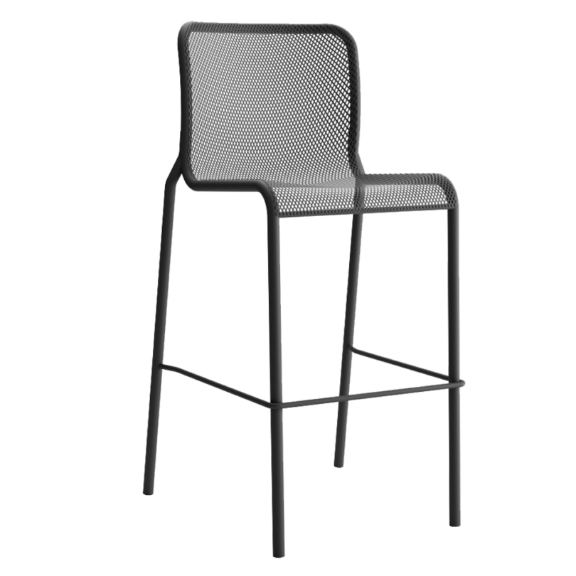 High stool with 4 legs made of expanded metal mesh welded to a curved tubular galvanised steel frame, polyester powder coated.