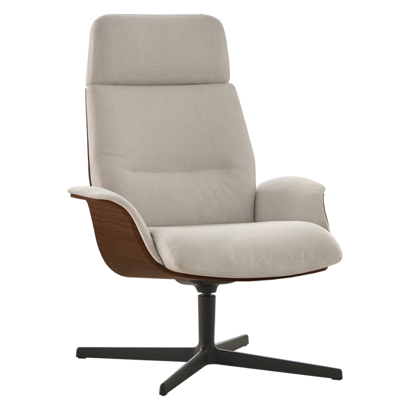 Upholstered lounge armchair with high back and outer shell in oak or walnut veneer. Four spoke aluminum, swivel base with self-return column.