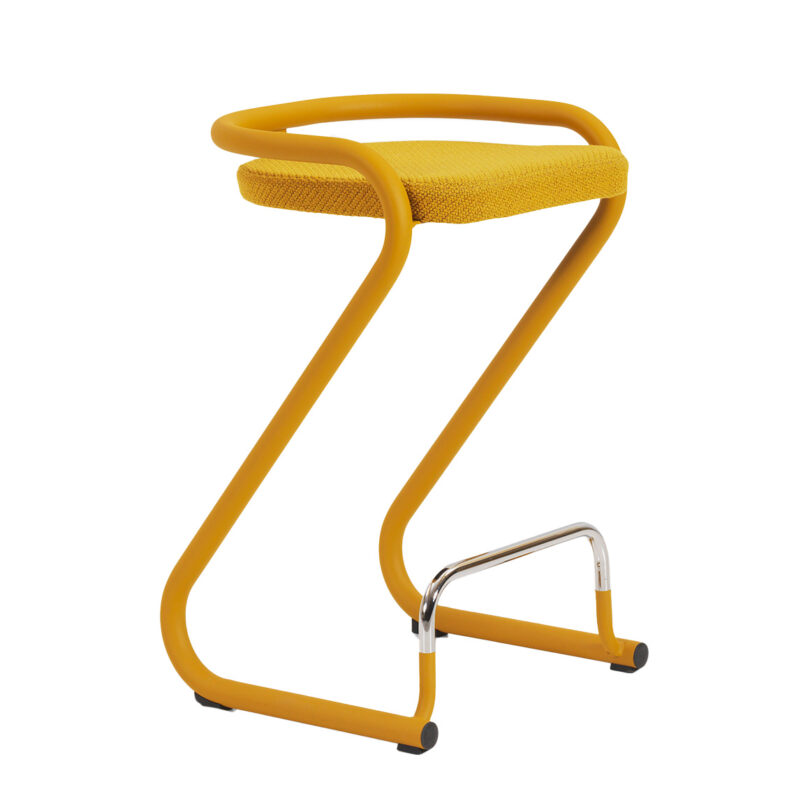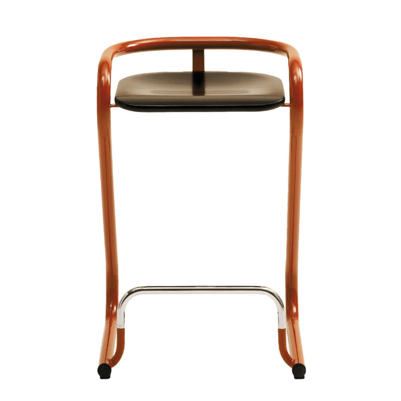 Counterstool with an upholstered seat and a powder coated or chromium plated tubular steel frame with plastic guides and chrome footrest.
