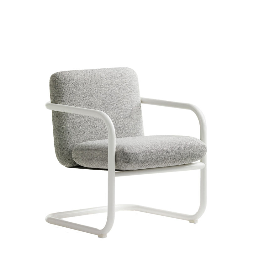 Easy chair with chromium plated or powder coated tubular steel frame and cushions of upholstered highly resilient polyurethane foam