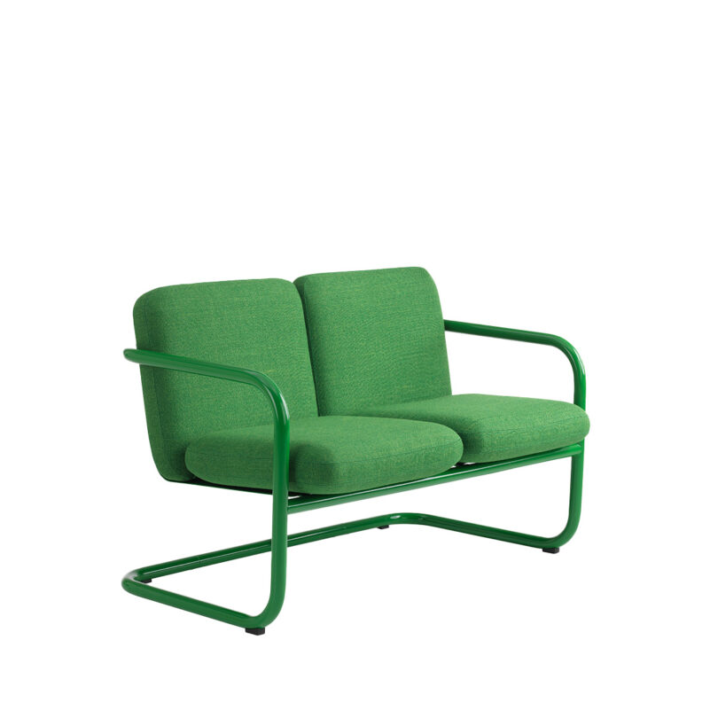 Sofa with chromium plated or powder coated tubular steel frame and cushions of upholstered highly resilient polyurethane foam