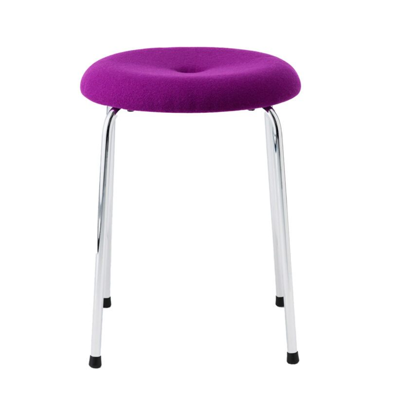 Stackable stool with upholstered seat and a powder coated or chromium plated tubular steel frame.