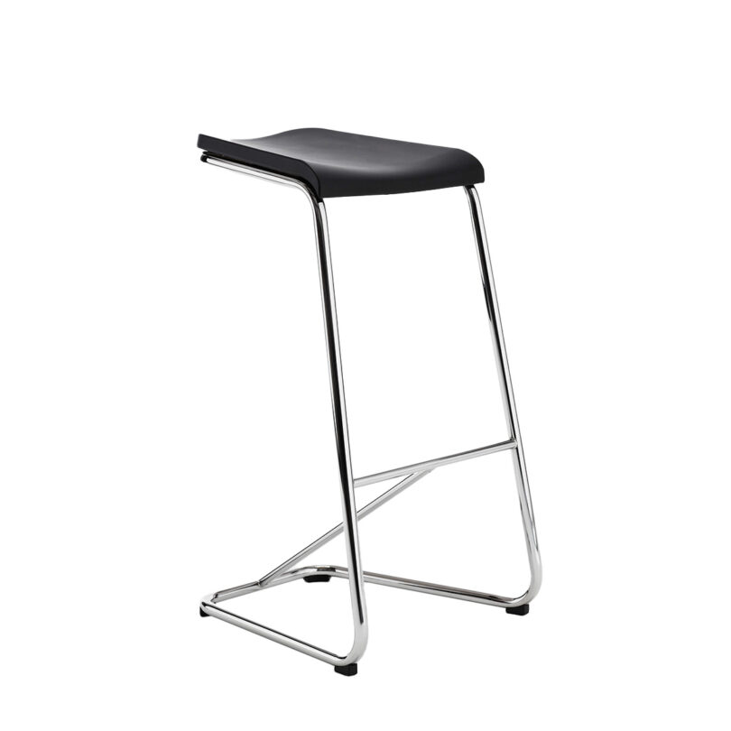 Counter stool with seat of molded wood and polyurethane foam, on a powder coated or chromium plated steel cantilever frame. With chrome footrest