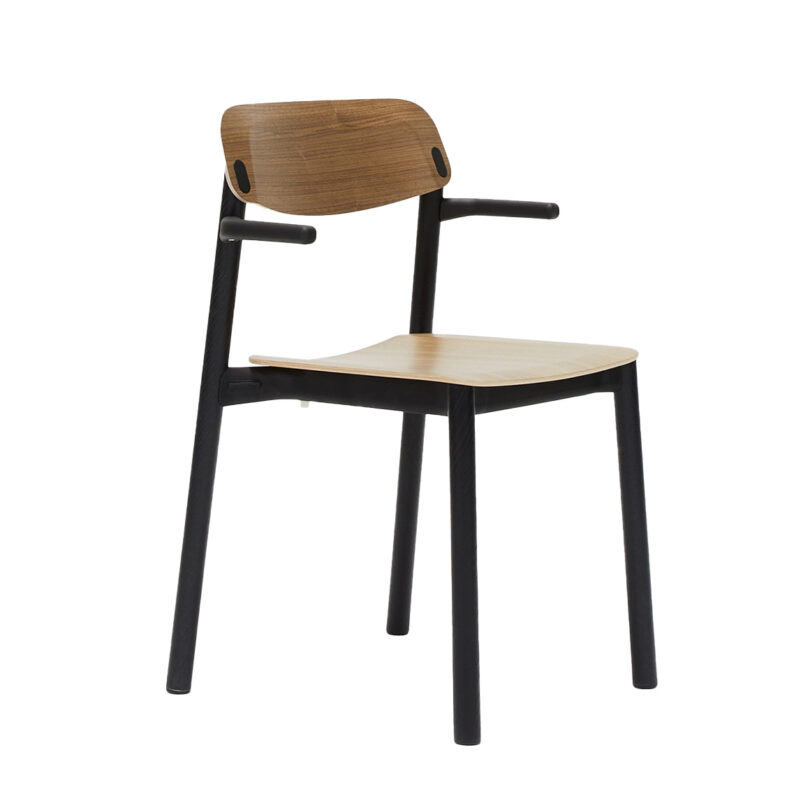 Stackable sidechair with epoxy powdercoat frame and seat & back in plain or stained ash. Arms in polyamide